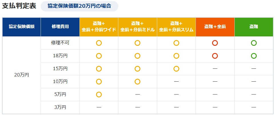 | 補償対象自転車 | 1万円~100万円 | 1万円~995万円 | 10万円以上 |